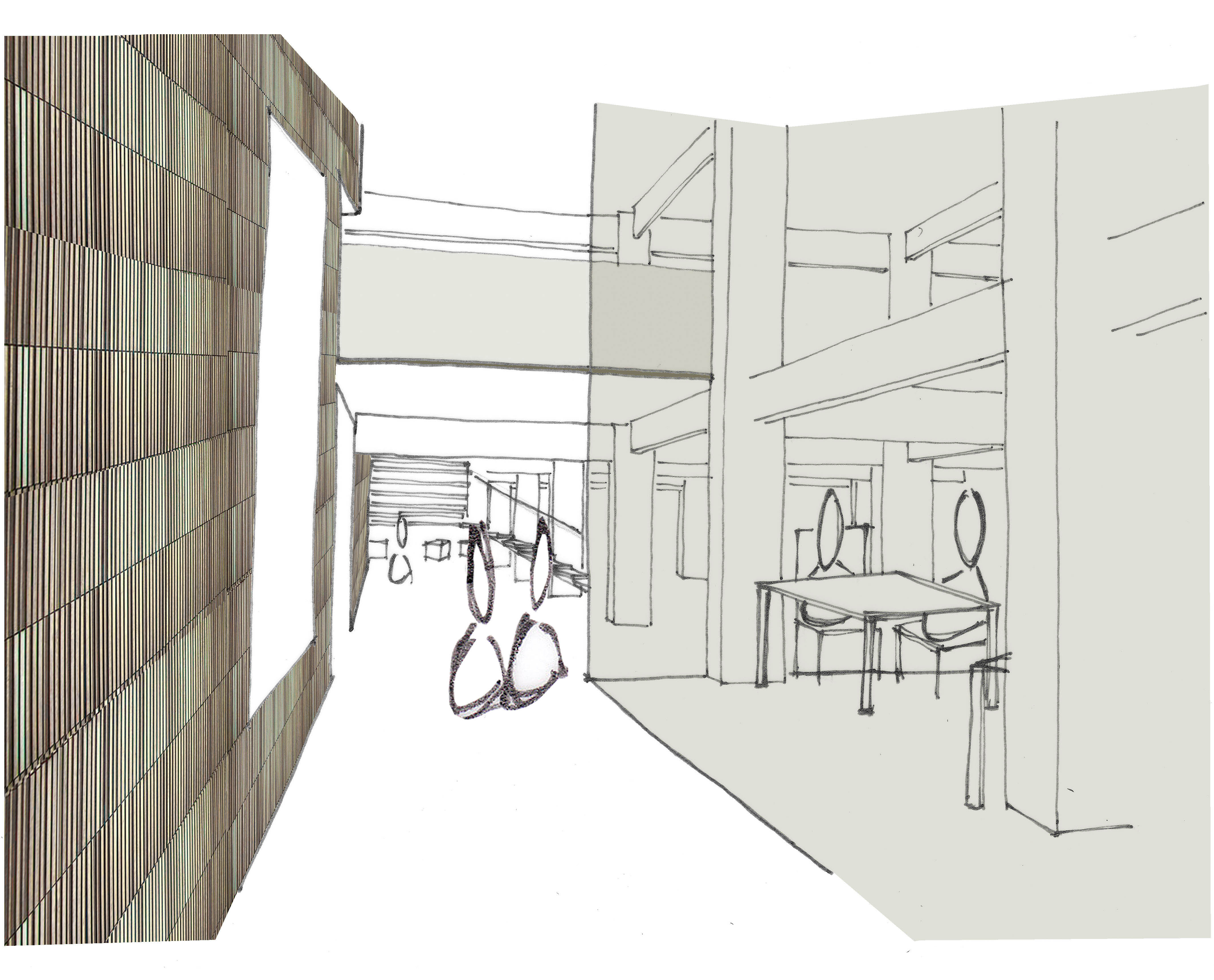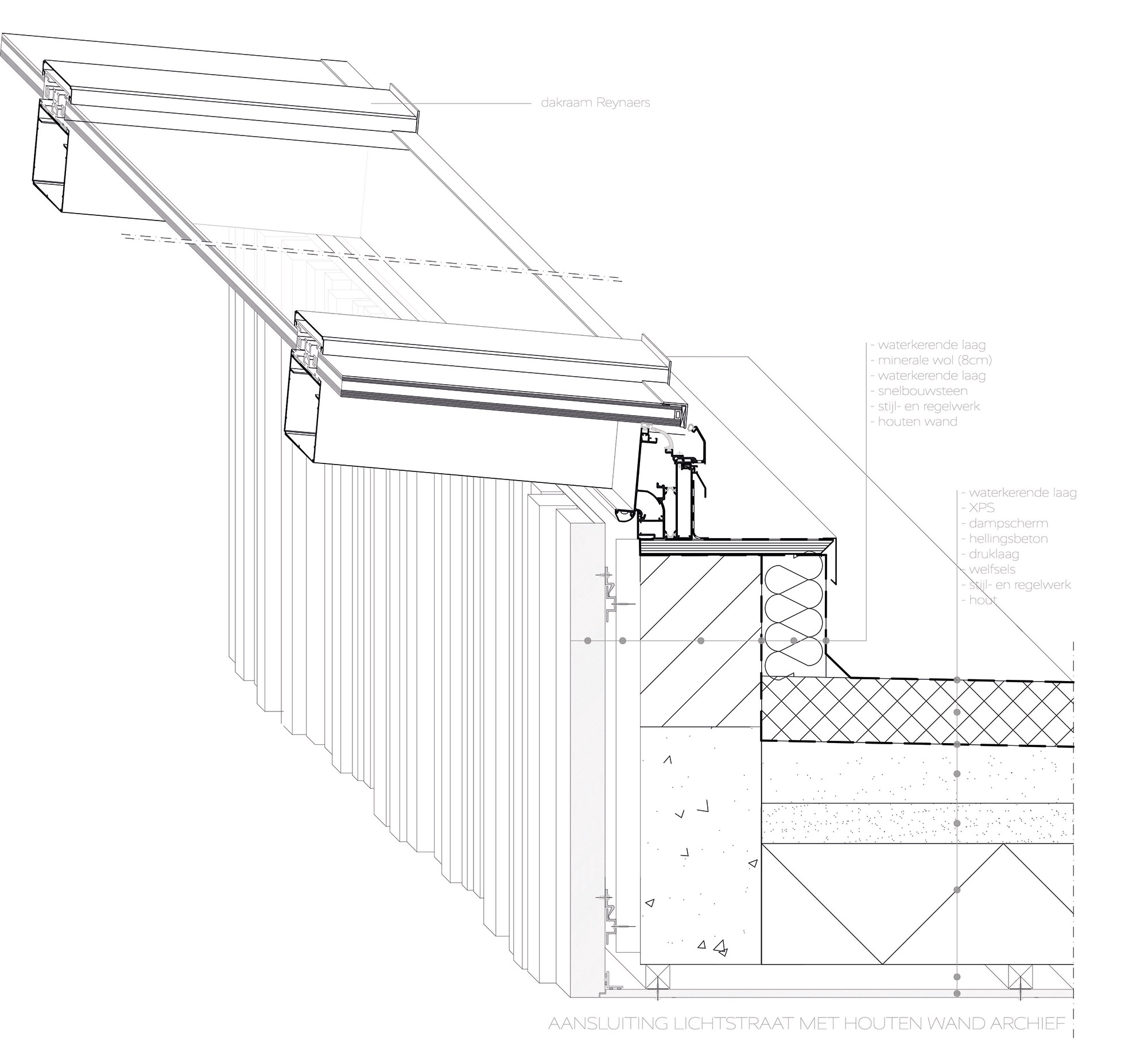 Door langs de binnenzijde te isoleren, blijft de karaktervolle gevel behouden. In bestaande gevel wordt op strategische plaatsen grote raamopeningen toegevoegd op licht naar binnen te trekken. Zo ontstaat een symbiose tussen oud en nieuw. Wanneer je binnenkomt, krijg je een zicht op de monumentale trap die de verschillende platvormen en functies met elkaar verbind. Hierdoor krijg je een overzichtelijk beeld op de organisatie van het gebouw. De indeling is leesbaar en eerlijk gehouden. Ruimtelijkheid wordt gecreëerd door de strategische plaatsing van de verschillende functies. Het volume van het archief krijgt een houten bekleding met latjes, geïnspireerd op een open boekenkast en vormt zo een esthetisch verbinden element doorheen het gebouw. De structuur van het gebouw met zijn balken en kolommen wordt zo veel mogelijk behouden. Dit vormt een tweede esthetische drager doorheen het gebouw. De bestaande gevel, bestaande structurele elementen, nieuwe houten archiefwand de monumentale trappenhal van de foyer en de volumes van het auditorium bepalen samen de nieuwe ruimtelijkheid van het project. Ook binnen creëren we zo een symbiose tussen het bestaande en het nieuwe. Een lichtstraat onderscheidt het volume van het archief met deze van de voorliggende functies. Deze lichtstraat wordt doorgetrokken tot de gelijkvloerse. Dit om zo veel mogelijk licht binnen te laten, maar ook om de leesbaarheid van de locatie van de verschillende functies te bevorderen. Tussen de leesruimte en het archief is een loopbrug aanwezig om zo een gemakkelijke en snelle circulatie toe te laten.