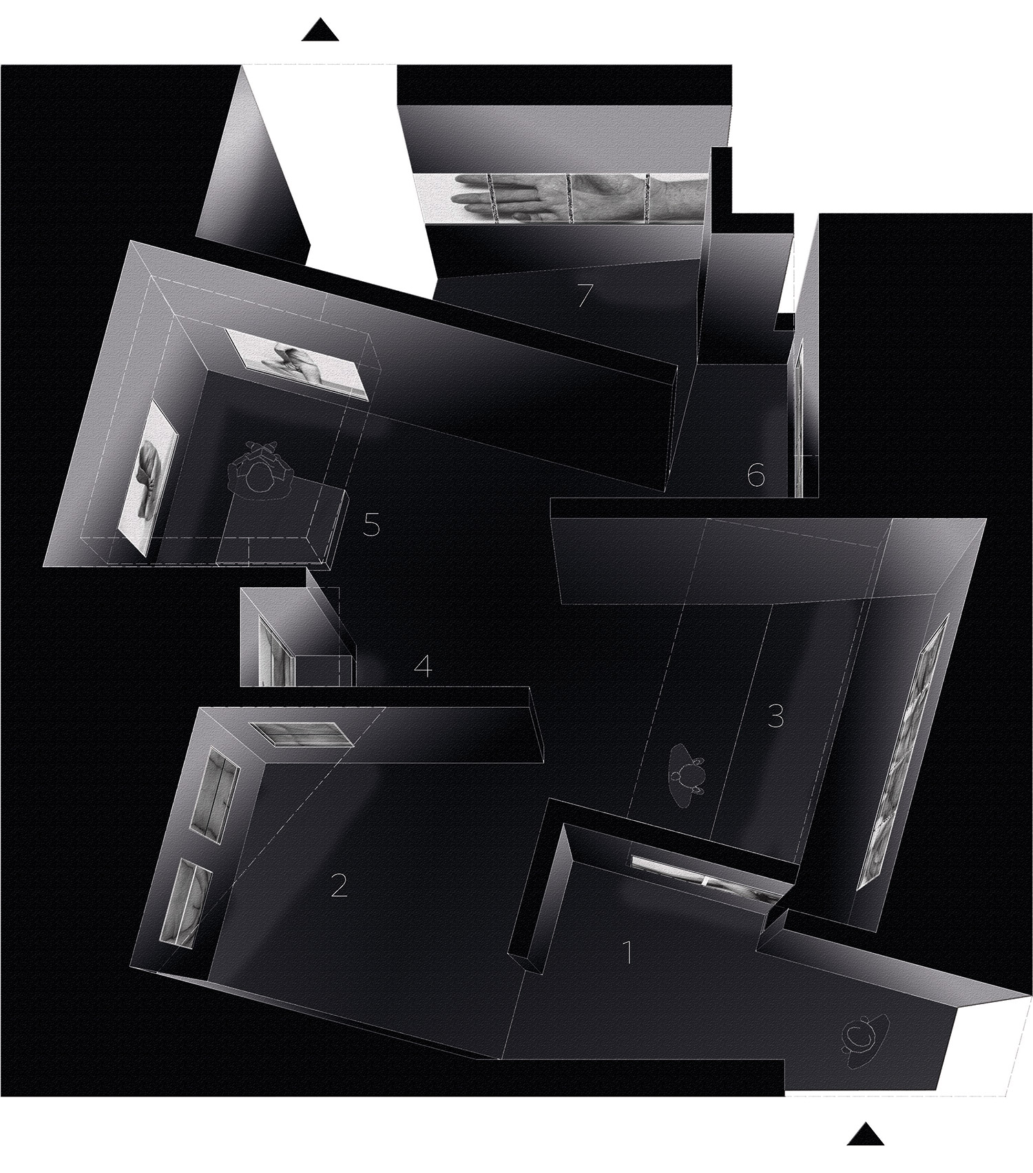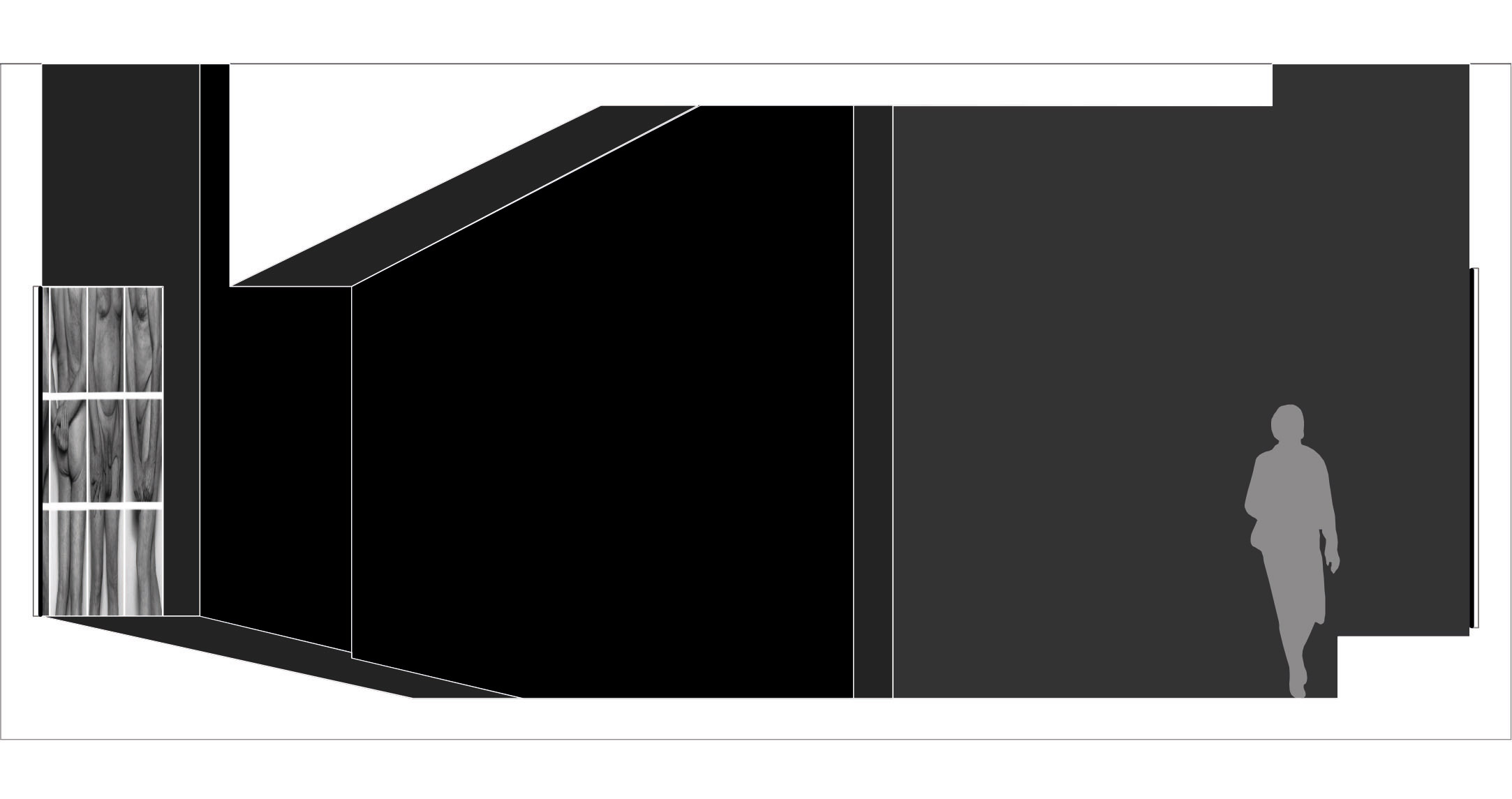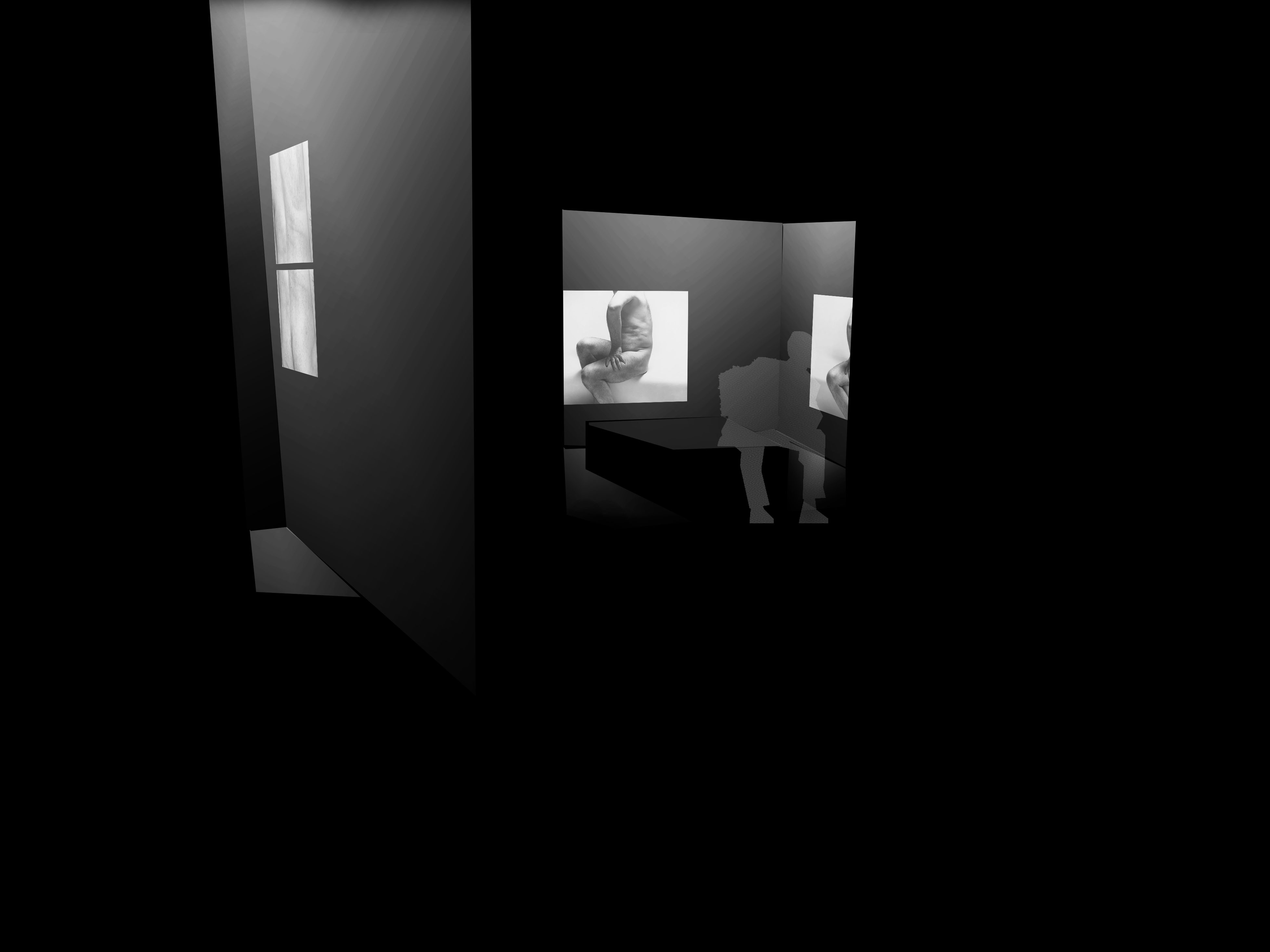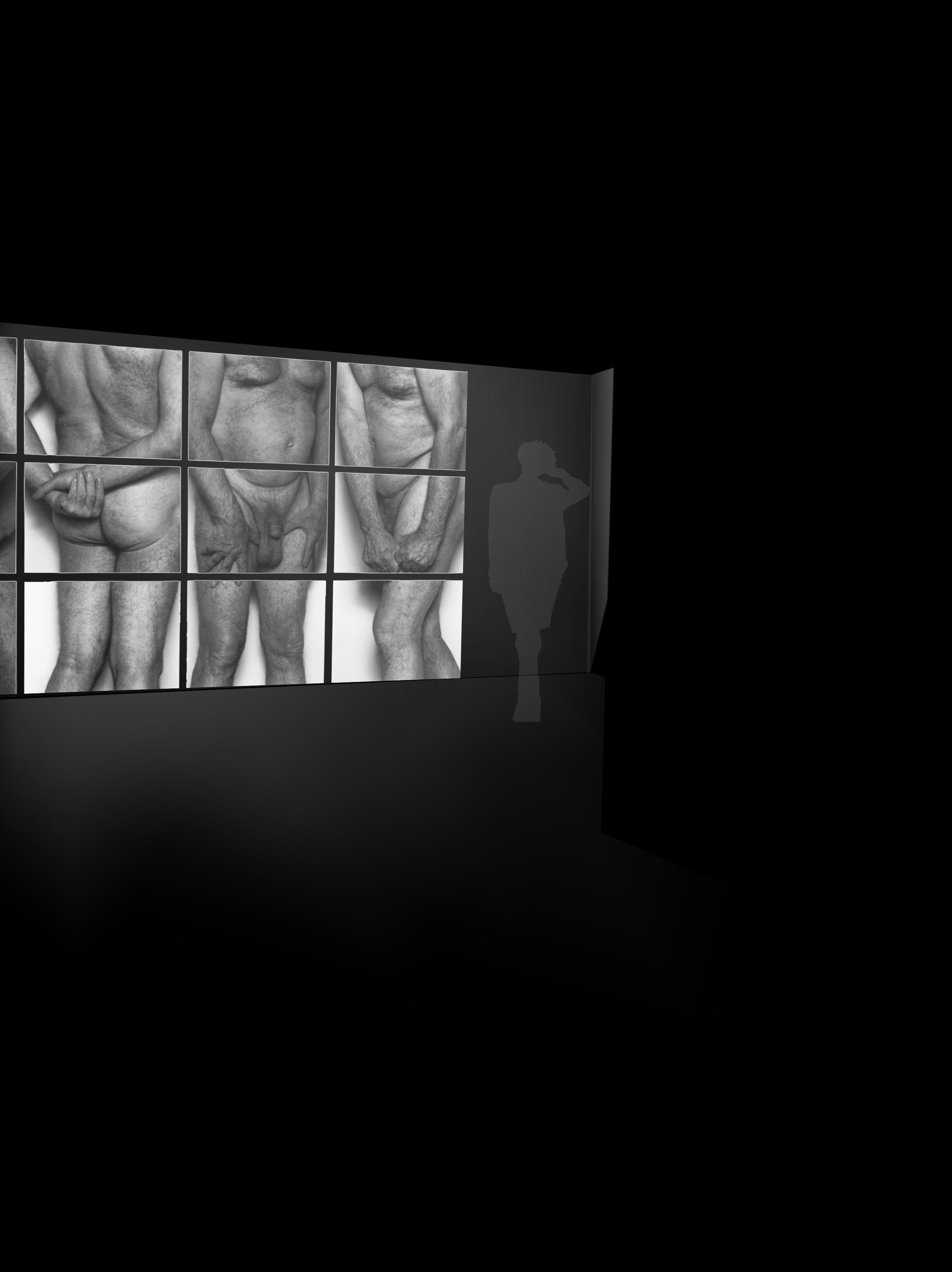 John Coplans was een fotograaf die zijn eigen oude mannenlichaam fotografeerde op een speelse, bijna sculpturale, wijze. Zo creëerde hij een poëzie in zijn werk. Hij gaat hiermee in tegen de trend van het schoonheidsideaal: (een jong knap vrouwenlichaam). Voor velen wordt het als confronterend ervaren om naar zijn kunst te kijken. In dit ontwerp voor de expografie heb ik deze confrontatie nog intiemer en duidelijker willen maken. In tegenstelling tot de grote witte zalen waar zijn werken meestal in tentoongesteld worden, wou ik de foto’s van John Coplans net in intiemere zwarte ruimten etaleren. Zowel door de zwarte achtergrond, als door de aaneenschakeling van in vorm en hoogte verschillende ruimtes, wordt een ontdekkingswandeling gecreëerd die het oog van de toeschouwer steeds naar de foto’s leidt. De beleving van de ruimten en de beleving van de foto’s lopen parallel, met een humoristische toets. De lichtinval focust zich op de werken. Dit alles doet de toeschouwer vertragen en langer stilstaan bij de kunst en zijn poëzie. Het oude mannenlichaam wordt op verschillende wijze ontdekt doorheen de expografie. De confrontatie uitvergroot.
