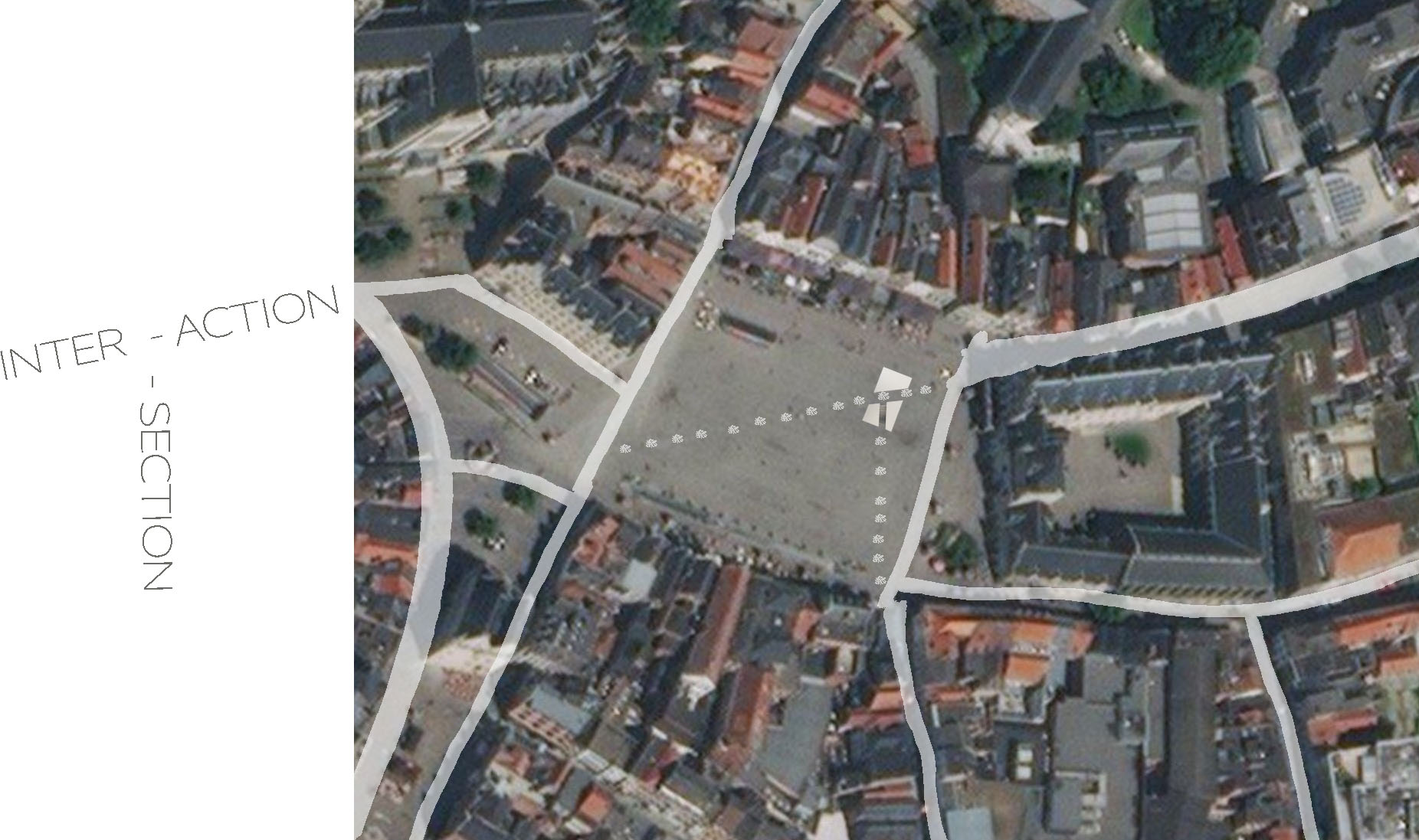 Inrichting van een verbrlijfsruimte voor een reiziger in doortocht op de Grote Markt te Mechelen, vertrekkende vanuit het volume van een garagebox. De beleving van de reizigers stond hierbij centraal. Ik heb me laten inspireren door de markt zelf. Het is een centraal punt in de stad, waar veel gebeurt en mensen elkaar ontmoeten, maar ondanks dat het hier druk kan zijn en er veel mensen aanwezig kunnen zijn, kan men zich toch alleen voelen. Vanuit deze dualiteit tussen wel connectie willen, maar niet kunnen leggen, of net omgekeerd, wel connectie leggen, maar niet willen, ben ik mijn concept gaan vormen: overnachting in een meubel. De garagebox werd op het kruispunt geplaatst van de voormalig aanwezige wegen, die nog steeds een belangrijke passageroute vormen. Inter-action / Inter-section. Overnachting in een meubel. Confrontatie tussen publiek en privé. Alleen, maar omringd met velen. Zicht- en lichtspel. Een plek op de leegte van de Grote Markt.