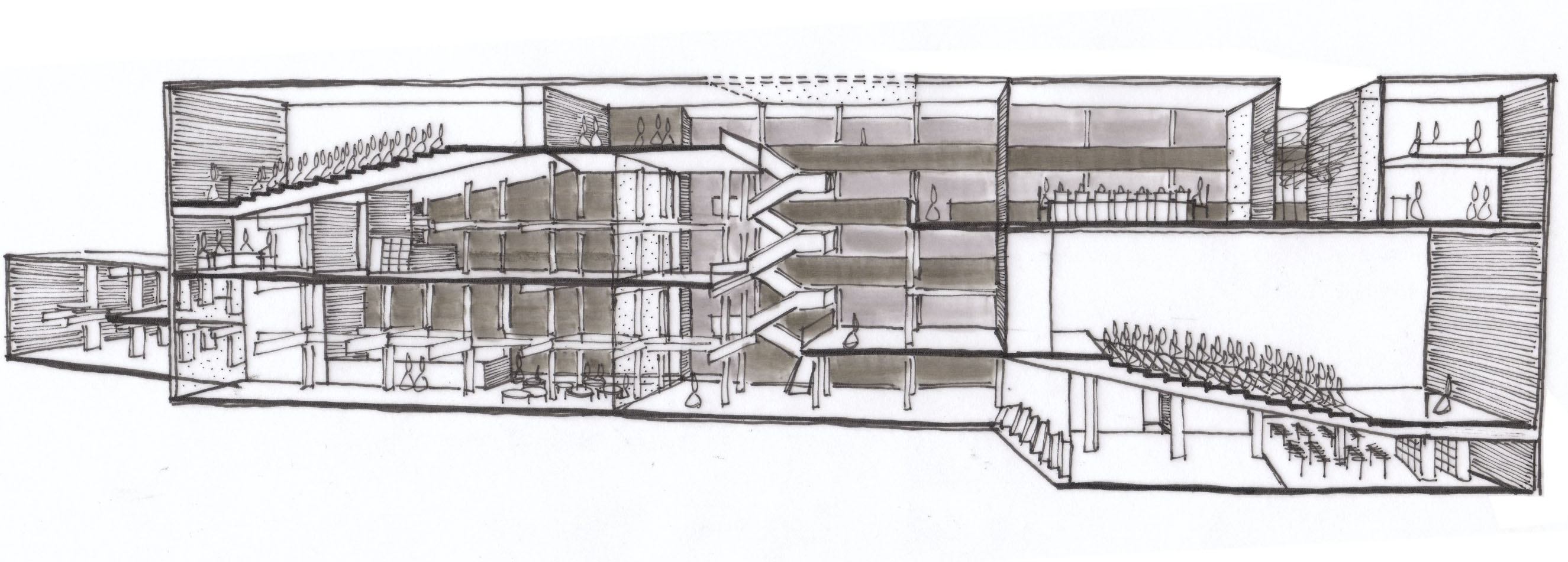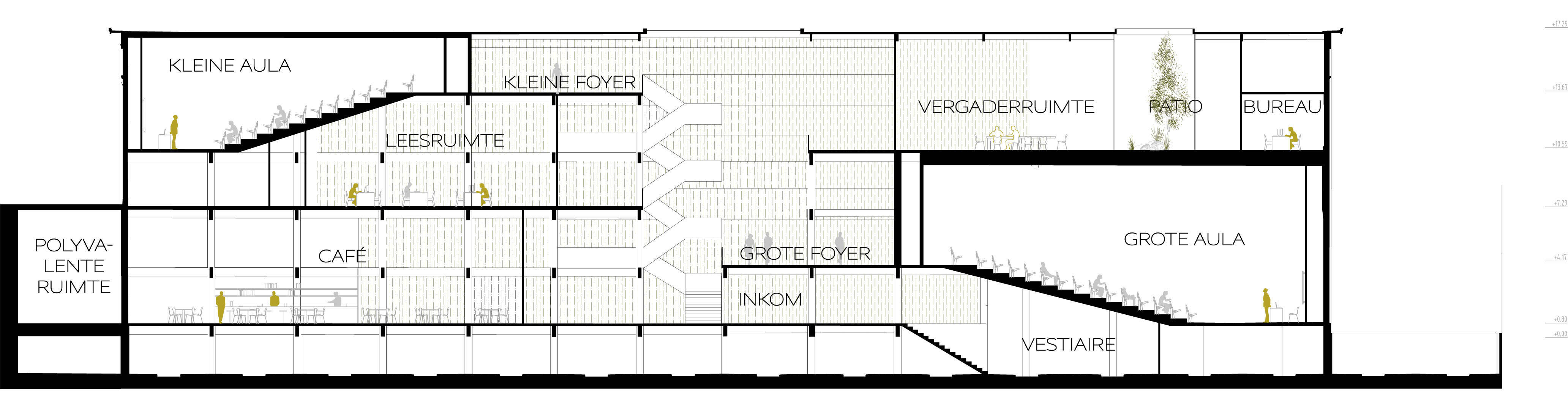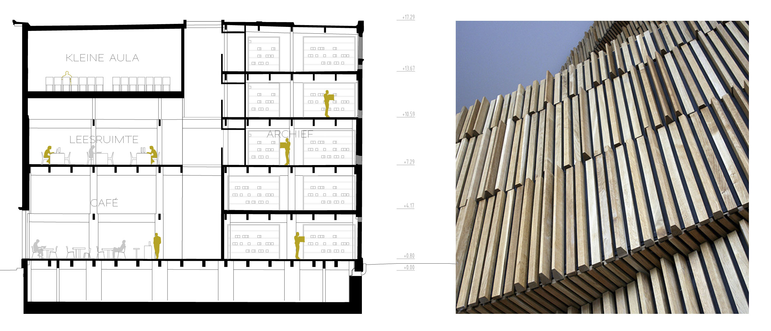 Door langs de binnenzijde te isoleren, blijft de karaktervolle gevel behouden. In bestaande gevel wordt op strategische plaatsen grote raamopeningen toegevoegd op licht naar binnen te trekken. Zo ontstaat een symbiose tussen oud en nieuw. Wanneer je binnenkomt, krijg je een zicht op de monumentale trap die de verschillende platvormen en functies met elkaar verbind. Hierdoor krijg je een overzichtelijk beeld op de organisatie van het gebouw. De indeling is leesbaar en eerlijk gehouden. Ruimtelijkheid wordt gecreëerd door de strategische plaatsing van de verschillende functies. Het volume van het archief krijgt een houten bekleding met latjes, geïnspireerd op een open boekenkast en vormt zo een esthetisch verbinden element doorheen het gebouw. De structuur van het gebouw met zijn balken en kolommen wordt zo veel mogelijk behouden. Dit vormt een tweede esthetische drager doorheen het gebouw. De bestaande gevel, bestaande structurele elementen, nieuwe houten archiefwand de monumentale trappenhal van de foyer en de volumes van het auditorium bepalen samen de nieuwe ruimtelijkheid van het project. Ook binnen creëren we zo een symbiose tussen het bestaande en het nieuwe. Een lichtstraat onderscheidt het volume van het archief met deze van de voorliggende functies. Deze lichtstraat wordt doorgetrokken tot de gelijkvloerse. Dit om zo veel mogelijk licht binnen te laten, maar ook om de leesbaarheid van de locatie van de verschillende functies te bevorderen. Tussen de leesruimte en het archief is een loopbrug aanwezig om zo een gemakkelijke en snelle circulatie toe te laten.