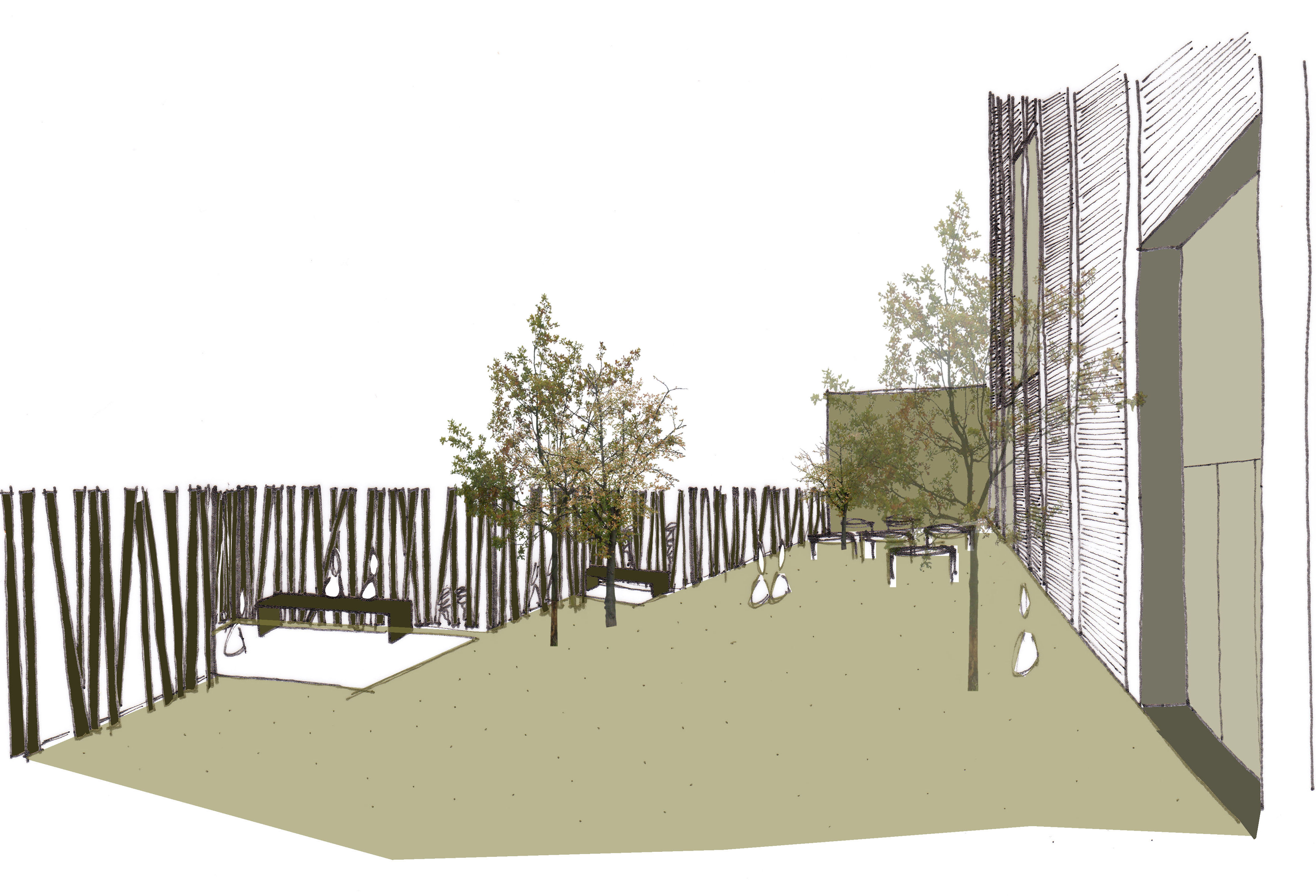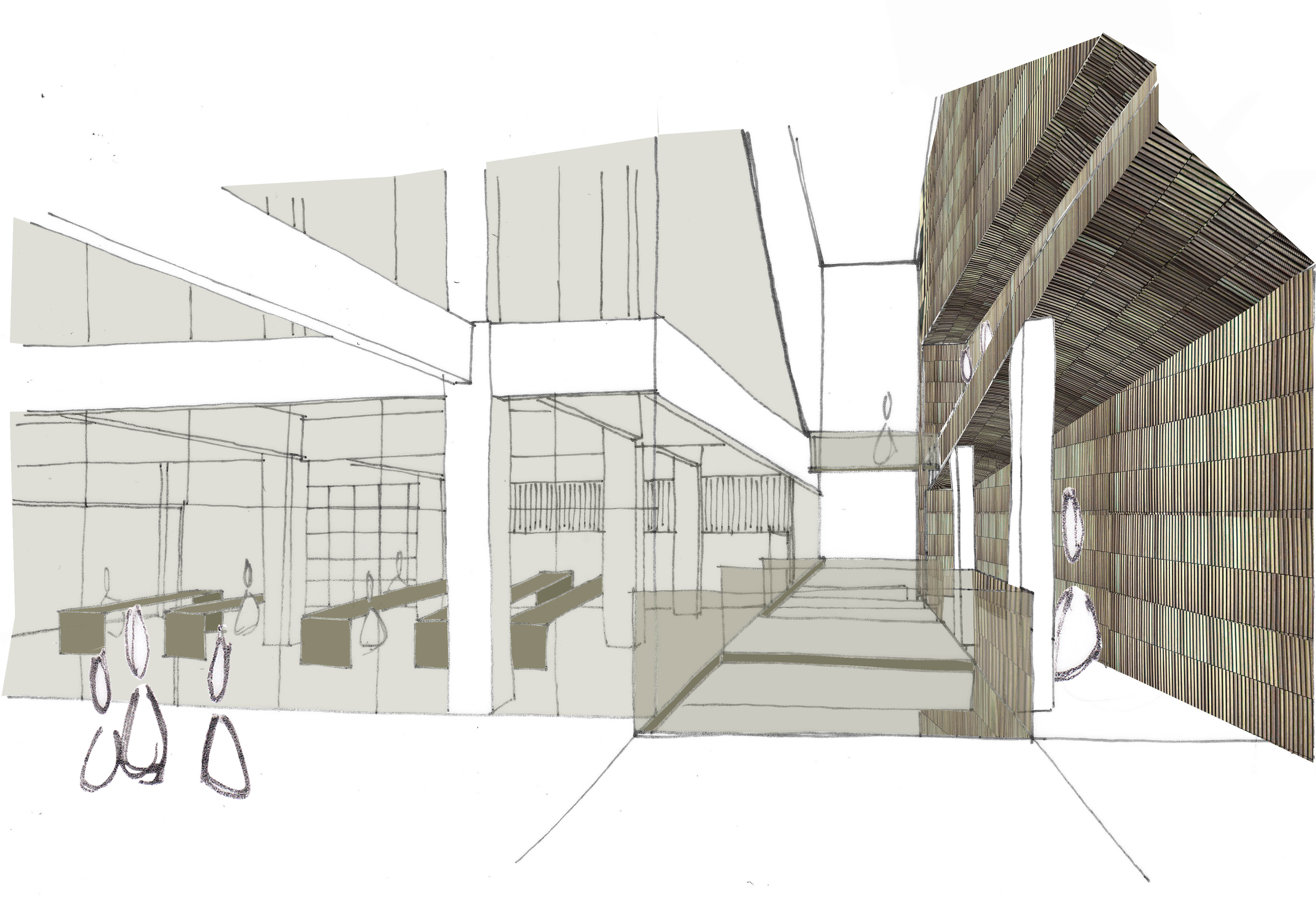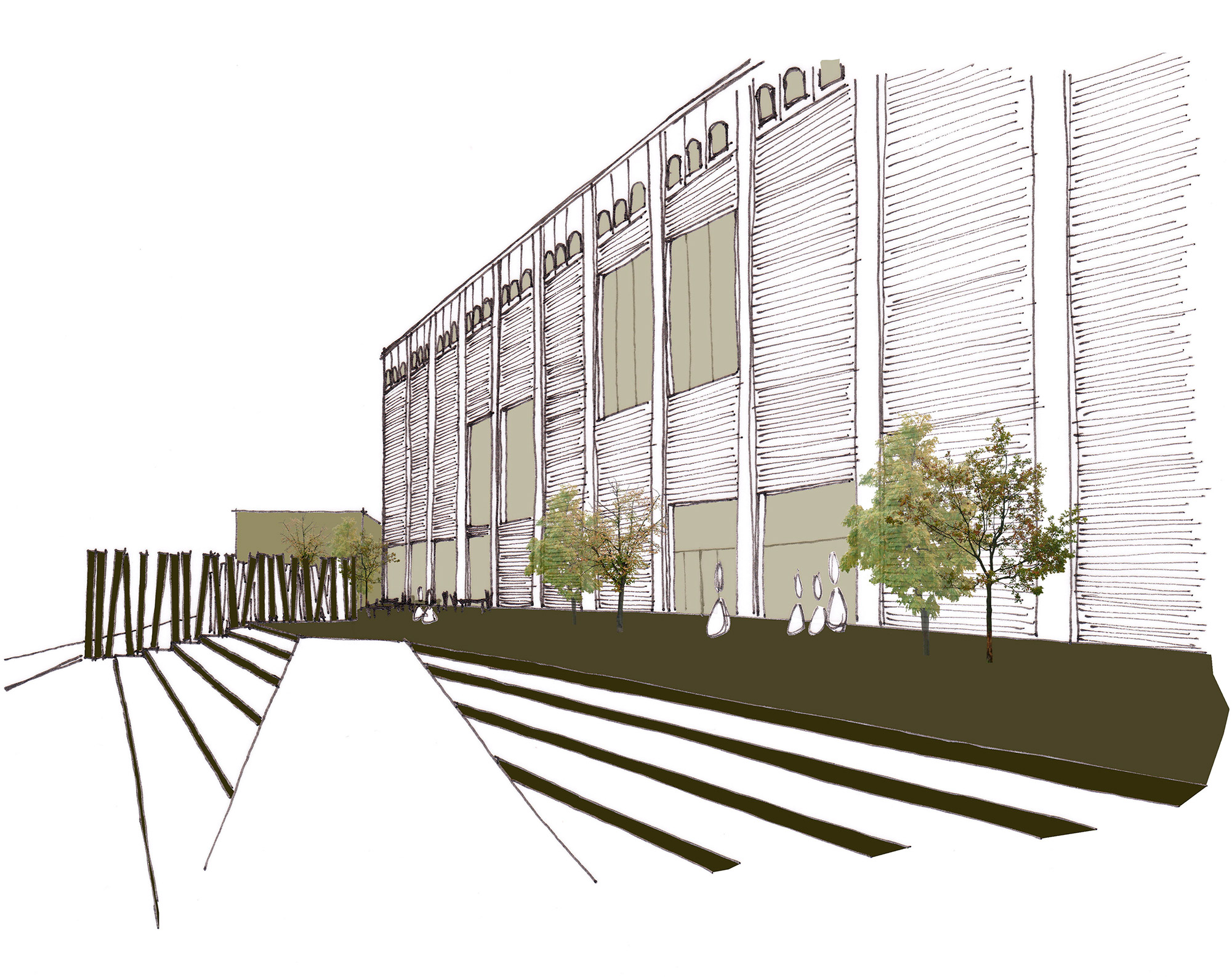 Door langs de binnenzijde te isoleren, blijft de karaktervolle gevel behouden. In bestaande gevel wordt op strategische plaatsen grote raamopeningen toegevoegd op licht naar binnen te trekken. Zo ontstaat een symbiose tussen oud en nieuw. Wanneer je binnenkomt, krijg je een zicht op de monumentale trap die de verschillende platvormen en functies met elkaar verbind. Hierdoor krijg je een overzichtelijk beeld op de organisatie van het gebouw. De indeling is leesbaar en eerlijk gehouden. Ruimtelijkheid wordt gecreëerd door de strategische plaatsing van de verschillende functies. Het volume van het archief krijgt een houten bekleding met latjes, geïnspireerd op een open boekenkast en vormt zo een esthetisch verbinden element doorheen het gebouw. De structuur van het gebouw met zijn balken en kolommen wordt zo veel mogelijk behouden. Dit vormt een tweede esthetische drager doorheen het gebouw. De bestaande gevel, bestaande structurele elementen, nieuwe houten archiefwand de monumentale trappenhal van de foyer en de volumes van het auditorium bepalen samen de nieuwe ruimtelijkheid van het project. Ook binnen creëren we zo een symbiose tussen het bestaande en het nieuwe. Een lichtstraat onderscheidt het volume van het archief met deze van de voorliggende functies. Deze lichtstraat wordt doorgetrokken tot de gelijkvloerse. Dit om zo veel mogelijk licht binnen te laten, maar ook om de leesbaarheid van de locatie van de verschillende functies te bevorderen. Tussen de leesruimte en het archief is een loopbrug aanwezig om zo een gemakkelijke en snelle circulatie toe te laten.