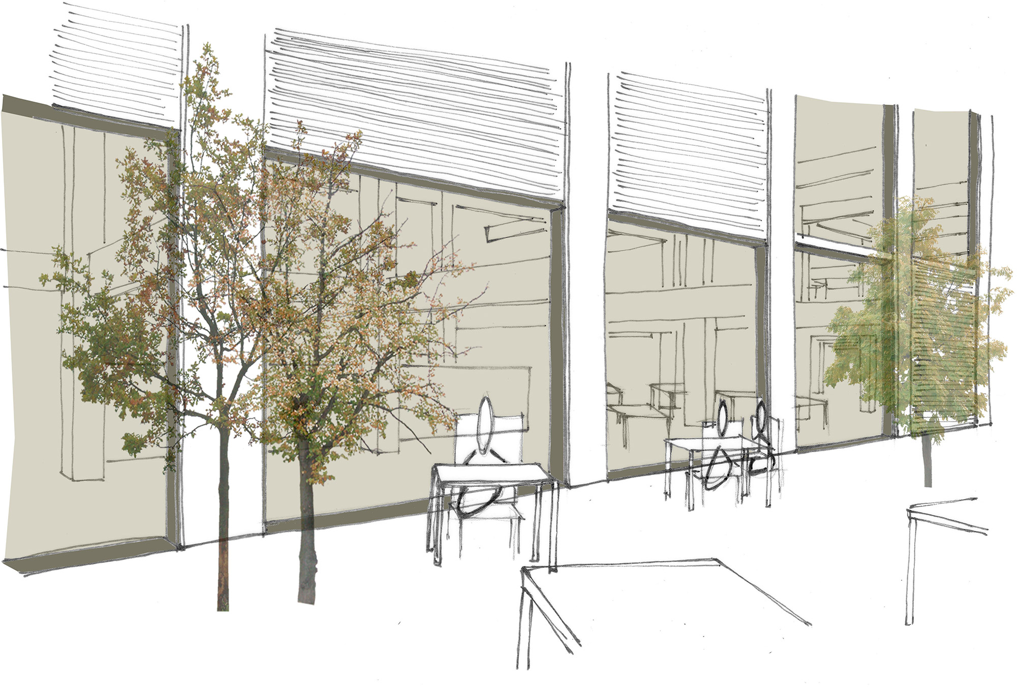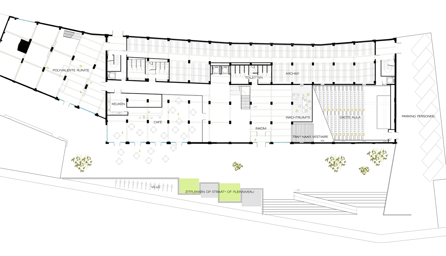 Het café en de polyvalente ruimte kregen hun plek op de gelijkvloerse. Zo staan ze in contact met het voor publiek toegankelijk plein voor het gebouw. In ze zomer wordt een deel van het plein ingenomen als terrasruimte voor de polyvalente ruimte en het café. Dit garandeert de levendige sfeer op het plein. Het plein ligt 80cm hoger dan het straatniveau. Er dient dus een balustrade voorzien te worden tussen het plein en de straat. Langsheen deze grens tussen het plein en de straat worden langs weerszijde verschillende vaste zitplekken voorzien. De polyvalente ruimte bevind zich in het bijgebouw. Zo kan deze apart worden gebruikt van het culturele centrum en ook buiten de openingsuren. Het café werd strategisch geplaatst tussen de polyvalente ruimte en de inkom. Zo kunnen deze laatsten beide gemakkelijk gebruik maken van de faciliteiten van het café.