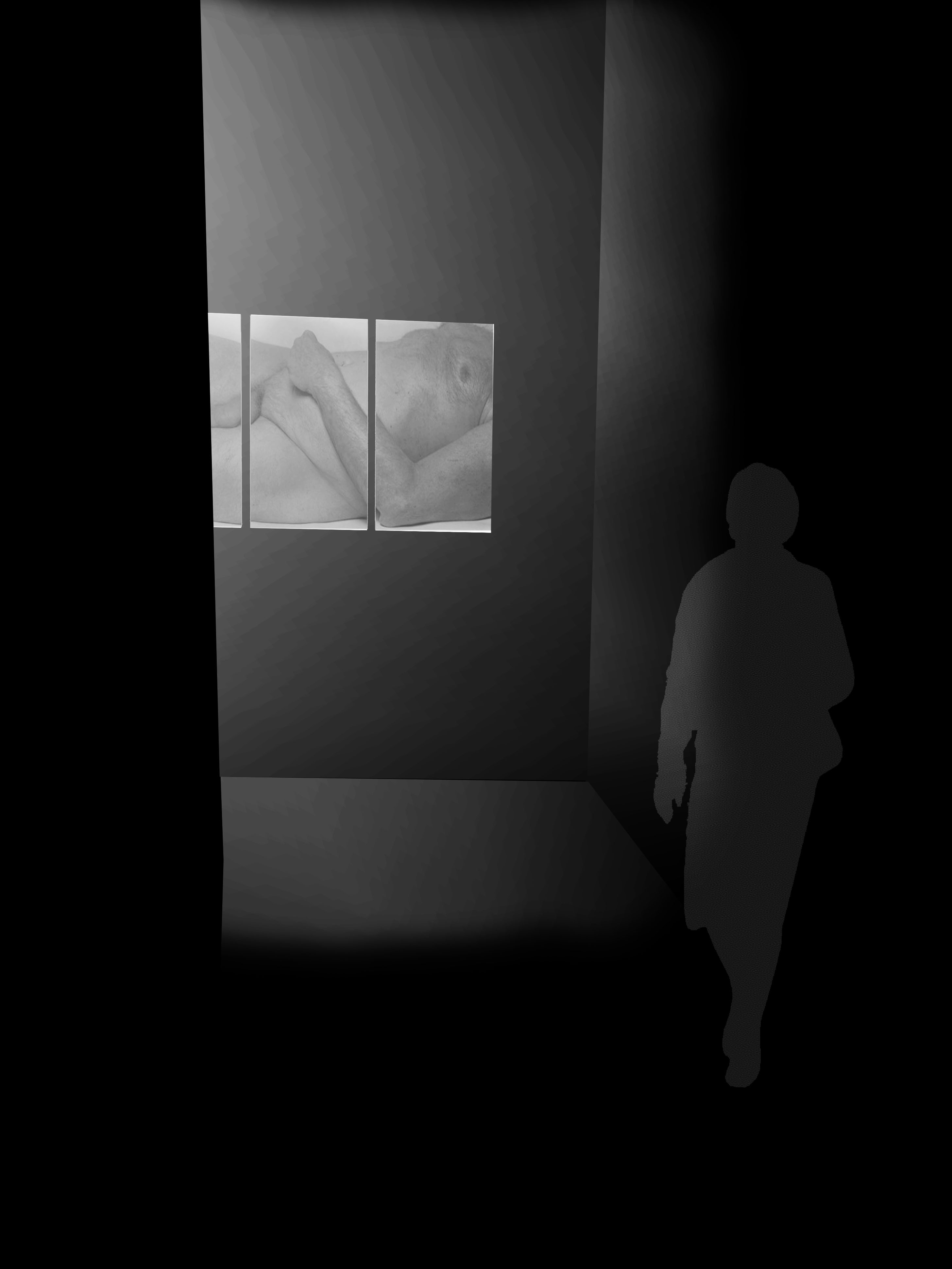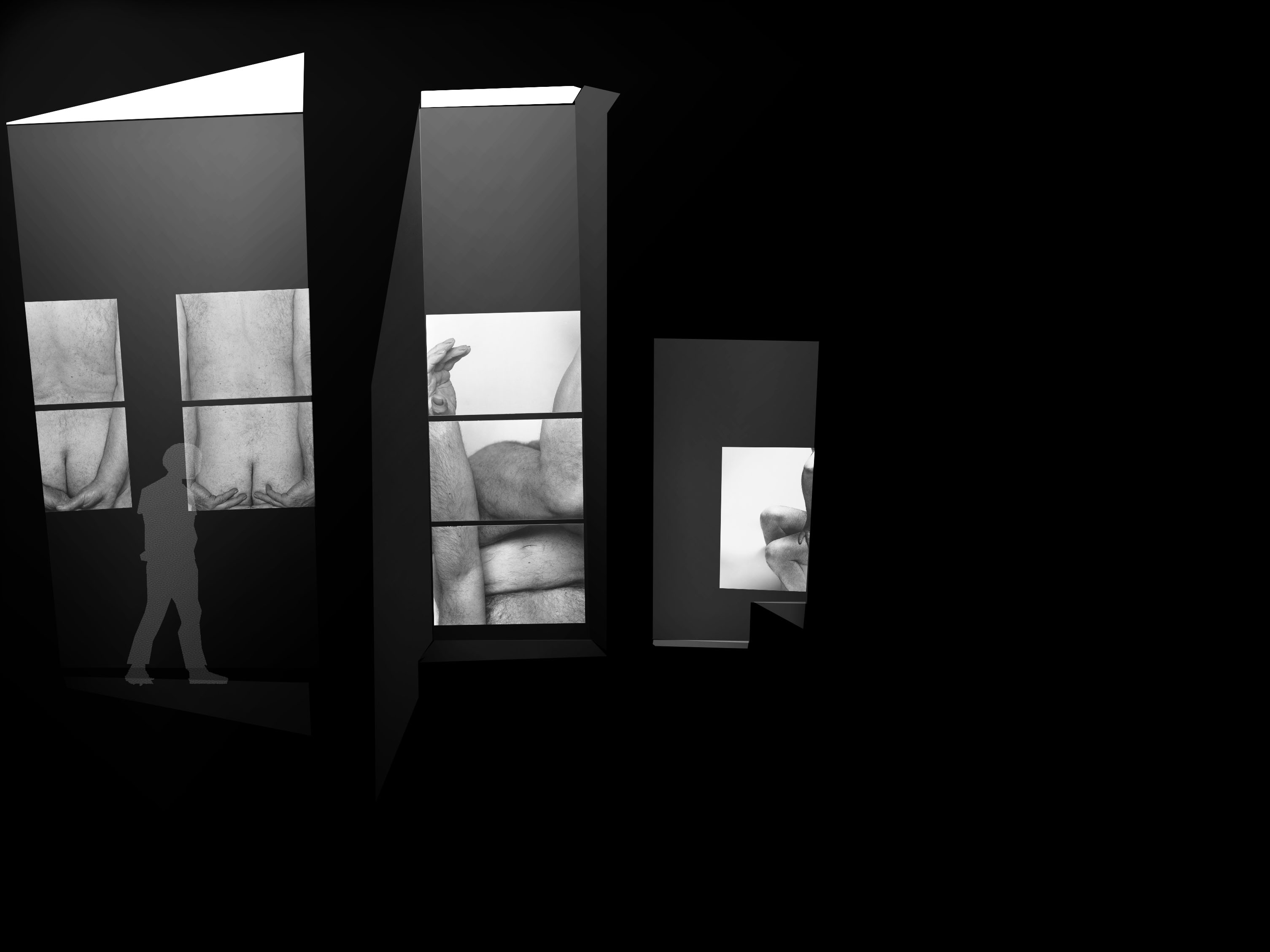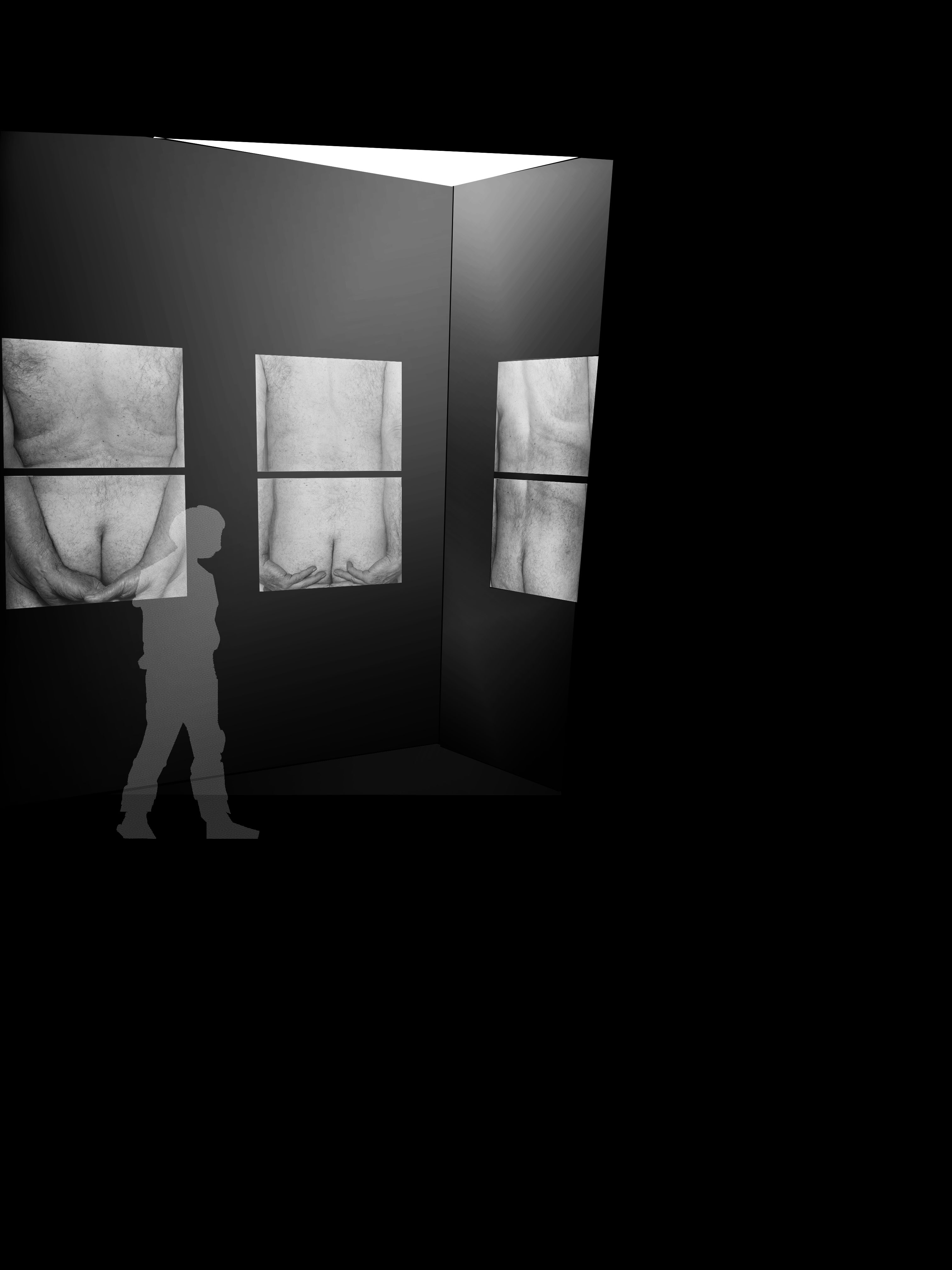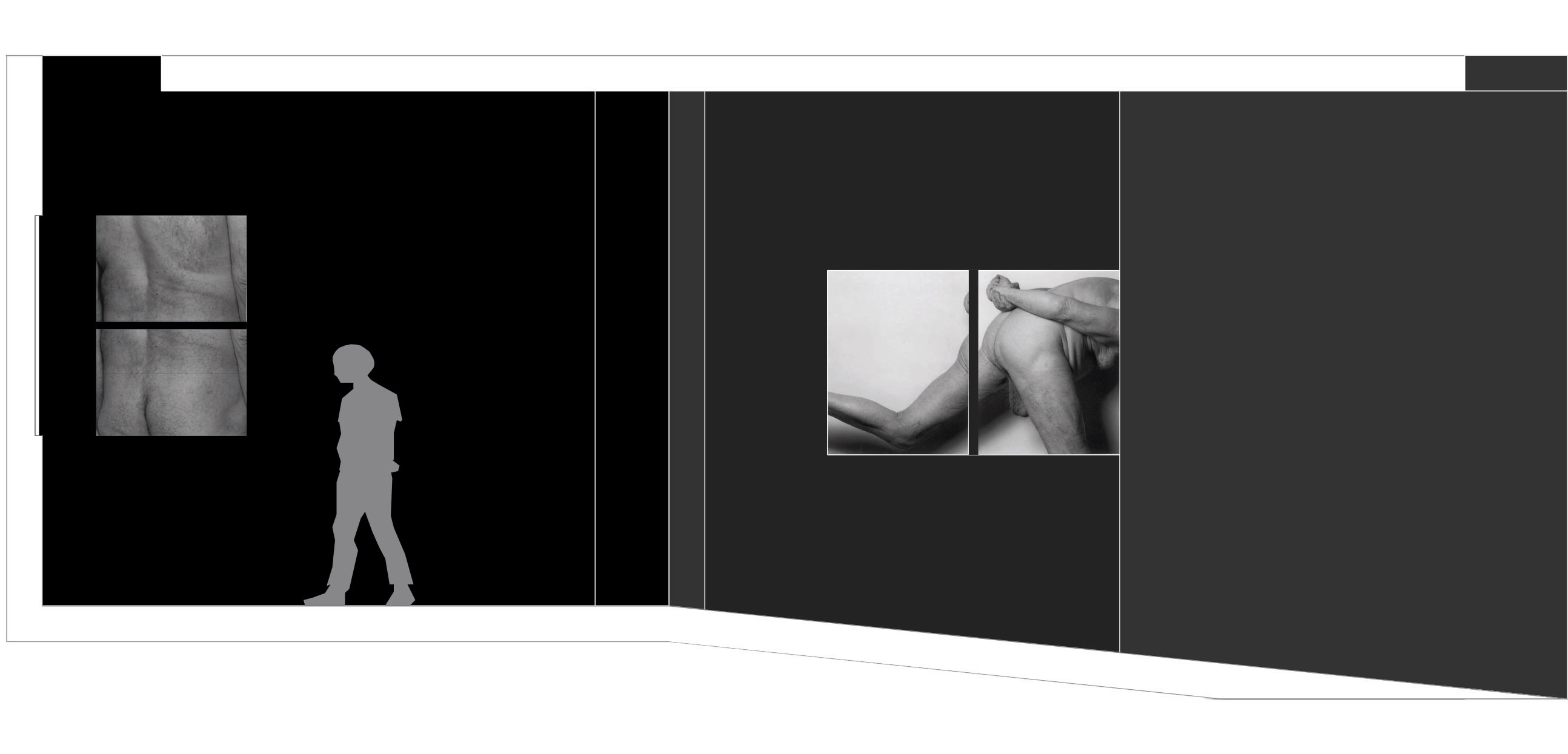 John Coplans was een fotograaf die zijn eigen oude mannenlichaam fotografeerde op een speelse, bijna sculpturale, wijze. Zo creëerde hij een poëzie in zijn werk. Hij gaat hiermee in tegen de trend van het schoonheidsideaal: (een jong knap vrouwenlichaam). Voor velen wordt het als confronterend ervaren om naar zijn kunst te kijken. In dit ontwerp voor de expografie heb ik deze confrontatie nog intiemer en duidelijker willen maken. In tegenstelling tot de grote witte zalen waar zijn werken meestal in tentoongesteld worden, wou ik de foto’s van John Coplans net in intiemere zwarte ruimten etaleren. Zowel door de zwarte achtergrond, als door de aaneenschakeling van in vorm en hoogte verschillende ruimtes, wordt een ontdekkingswandeling gecreëerd die het oog van de toeschouwer steeds naar de foto’s leidt. De beleving van de ruimten en de beleving van de foto’s lopen parallel, met een humoristische toets. De lichtinval focust zich op de werken. Dit alles doet de toeschouwer vertragen en langer stilstaan bij de kunst en zijn poëzie. Het oude mannenlichaam wordt op verschillende wijze ontdekt doorheen de expografie. De confrontatie uitvergroot.